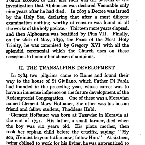 Saint Alphonsus (who founded the Congregation of the Most Holy Redeemer, known as the Redemptorists, in November 1732) was still alive when the transalpine development of the CSsR started. He died in 1787.